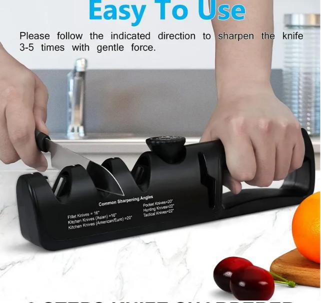 3.[Convenient Operation Knife sharpener]:These knife sharpeners offers two stages of sharpening for each knife style: a coarse ultra-hard Tungsten carbide side for restoring edges to dull blades and a finely grained ceramic side for honing and finishing edges, also useful for quick touch-ups.Just adjust the corresponding angle(We had marked the angle on the sharpener for different knifes),3 to 5 pulls through the sharpener is all it takes to reestablish any knife to a precision edge.