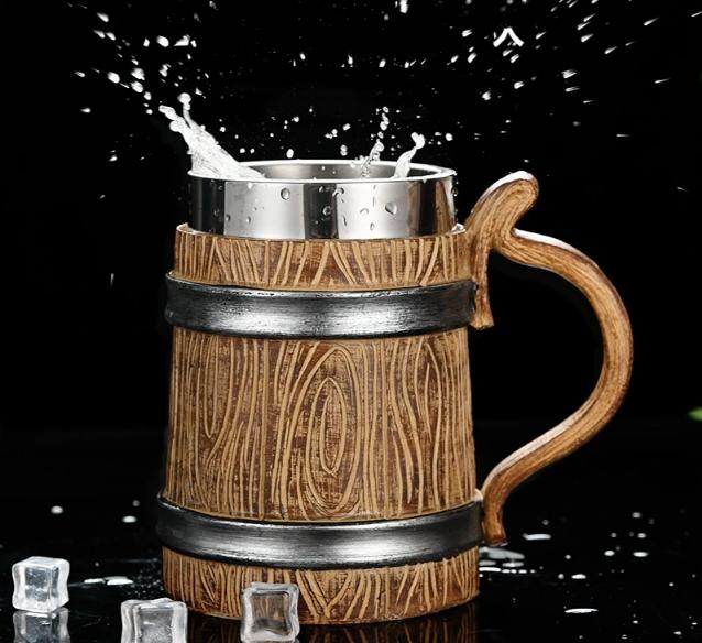 600ml Viking Wood Style Beer Mug 3D Resin Stainless Steel Coffee Cup Wine Glass Metal Double Wall Beer Jug Cup Thermal Barware